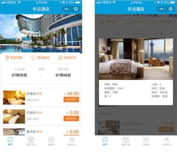 后台支持一键入住,一键退款、退押金、钟点房。支持微信支付、模板消息。客服实时收到新的订单信息,可以在手机端处理订单,支持按日期维护房价和房间数量,支持到店付款。支持积分功能,完成订房后获得的积分可以兑换代金券或优惠券,支持无线打印机和短信,评价打分功能,会员等级功能,二维码核销,积分或特产商城,会员充值(开发中)。